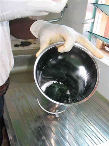 est cultivée. Notre souche, (de la " LONAR") vient de ce centre, et nous nous groupons avec Davougon pour commander et acheminer les intrants qui nourrissent notre micro-algue. | Le liquide verdatre du bassin est filtré à travers une toile habituellement utilisée en sérigraphie. La spiruline récoltée est ensuite égoutée et pressée, avant d'être transformée en "spaghetti", étalées sur des clayettes. |